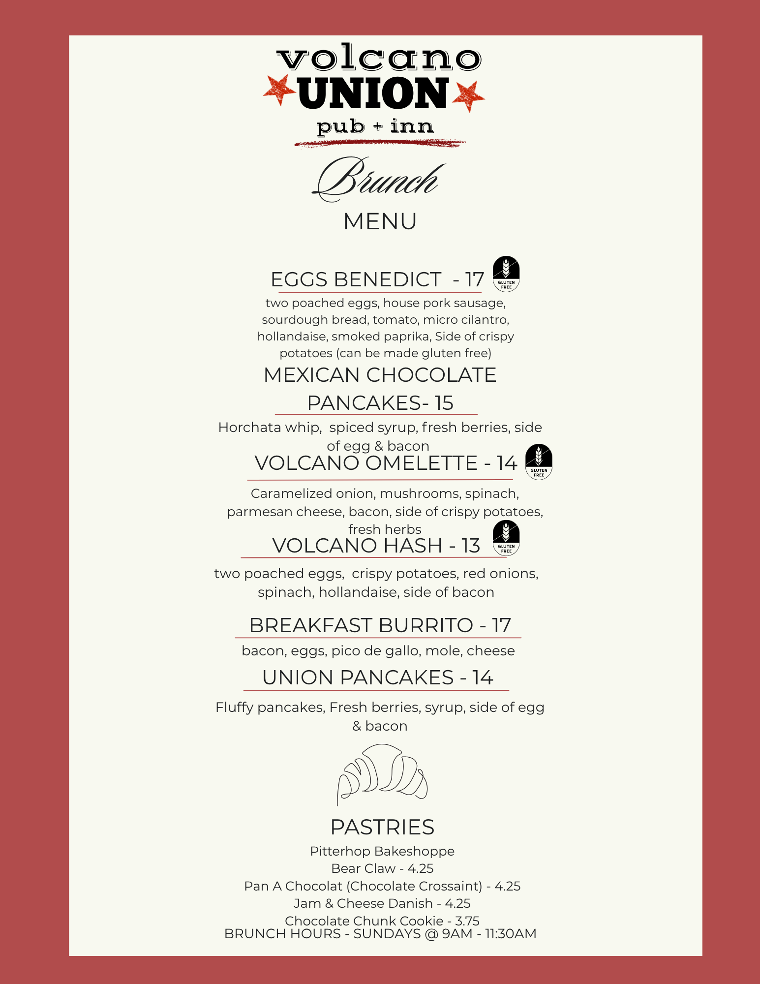 The Union is located at 21375 Consolation St. Volcano, just around the corner from Main Street and next to the Armory Hall. Parking is on the street or in the lot behind the Inn.